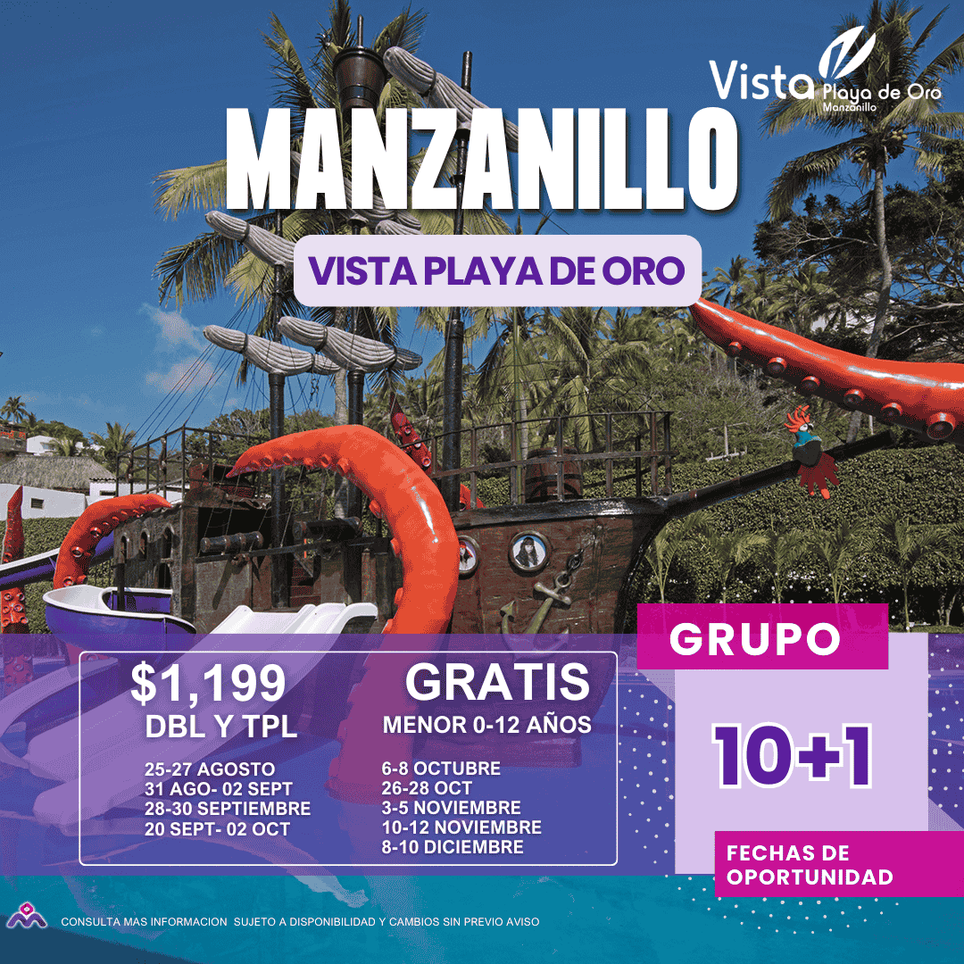 Descubre el encanto del Hotel Vista Playa de Oro Manzanillo, un resort familiar todo incluido ideal para disfrutar del sol, la playa y la diversión. Ubicado frente al mar, este hotel ofrece acceso directo a una de las playas más bonitas de Manzanillo, además de un ambiente colorido tipo “pueblito mexicano” que lo hace único.